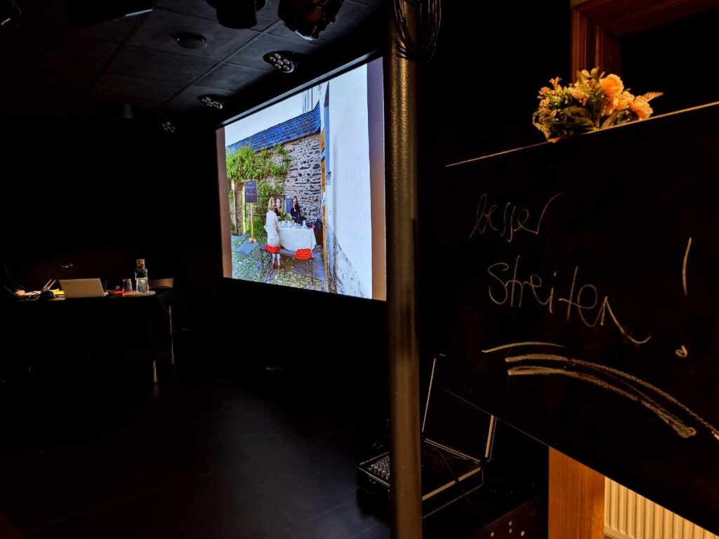 Am Tag danach gleich die nächste Lesung. Ein umgebauter Elektroladen in Ilmenau, das Kleinod. Eine Initiative, die sich während der Coronazeit gegründet hat, um ein kulturelles Leben zu gestalten. Auf den Stühlen stehen Sinnsprüche, die Projektion ist gestochen scharf. Im Publikum eine Landtagsabgeordnete, die am 5.2.2020 dabei war. Sie berichtet, wie es war, wie sie und ihre Kolleginnen an diesem Tagen darauf reagierten. Erstmals gibt es während einer Veranstaltung Gegenrede. Beim Thema »Frauen und Wut« ein empörter Zwischenruf. Es geht um die Frage, bis zu welchem Jahrzehnt Männer wie über Frauen entscheiden konnten. Irgendwie bin ich froh darüber. Immer nur Nicken, so sollte es auch nicht sein.